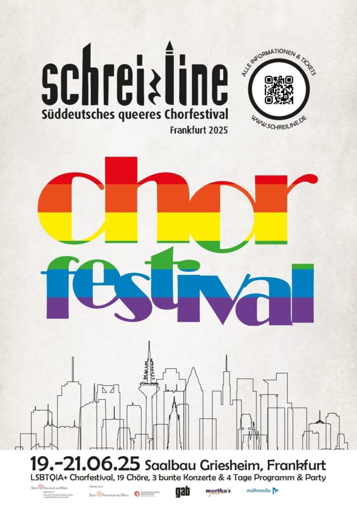 Schreiline 2025 ist das 15. süddeutsche schwul-lesbisch-queere-Chorfestival. Seit 1996 findet es alle zwei Jahre in verschiedenen großartigen Städten Süddeutschlands und der Schweiz statt. Jede Stadt hat dafür ihren eigenen kreativen Namen. Wir, die Frankfurter queeren Chöre DonnAcappella, die Mainsirenen und Liederliche Lesben, haben unser Festival „Schreiline“ getauft.
